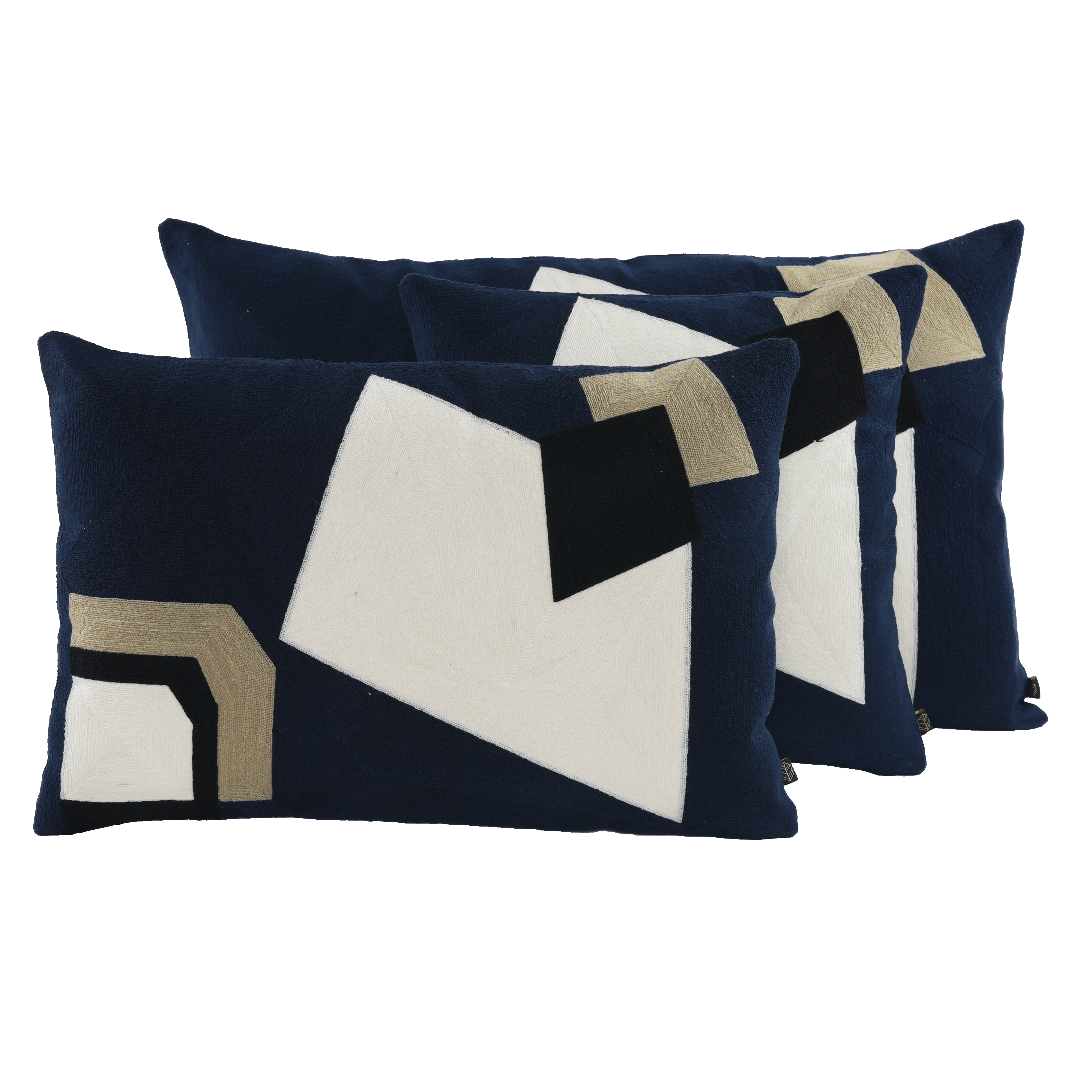 Très graphique, cette housse de coussin mêlant le bleu encre, le beige, le blanc et le noir ajoutera une touche de modernité et sophistication à votre canapé.