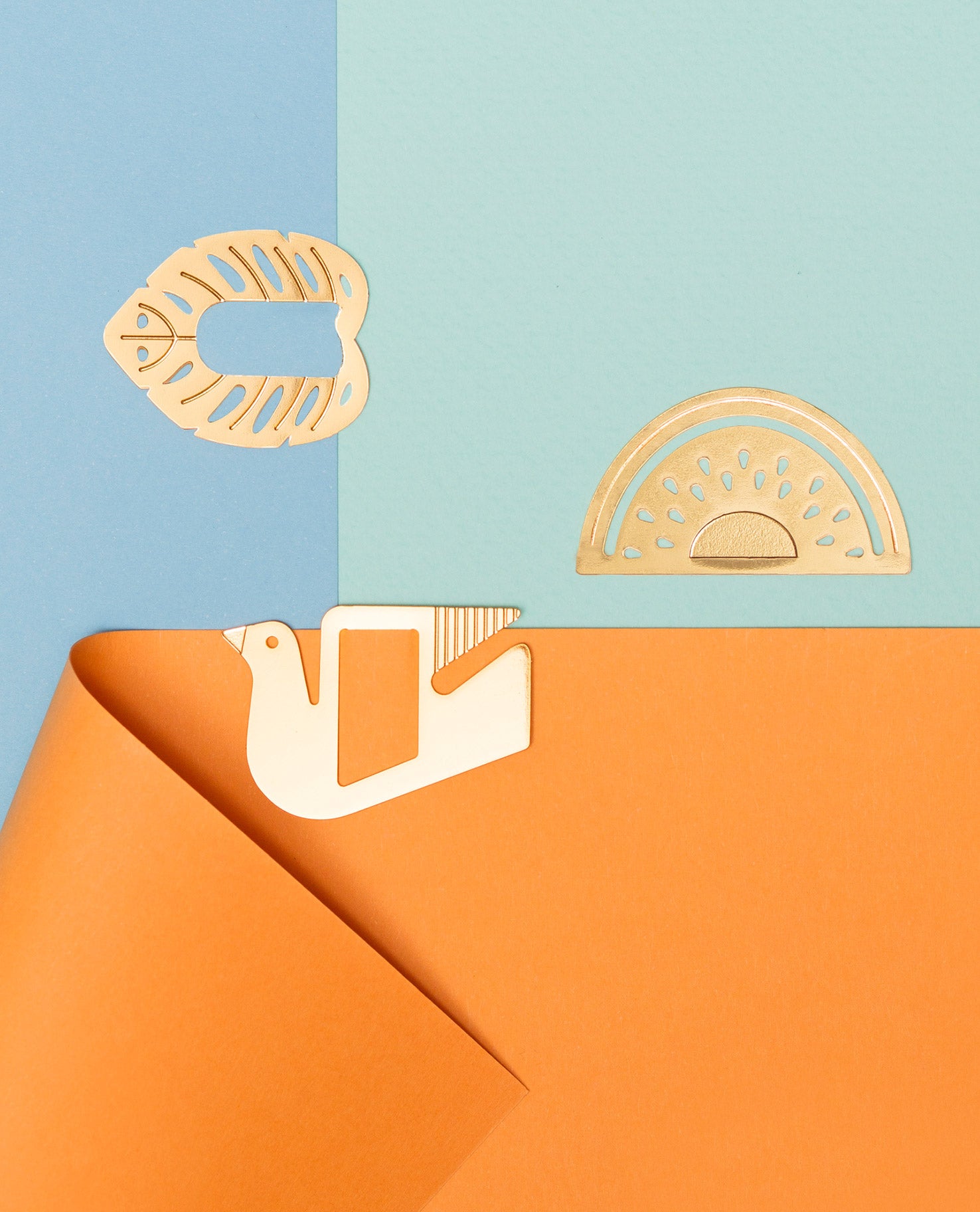 Ensemble de 3 marque-pages clips en métal : pastèque, oiseau et feuille.
