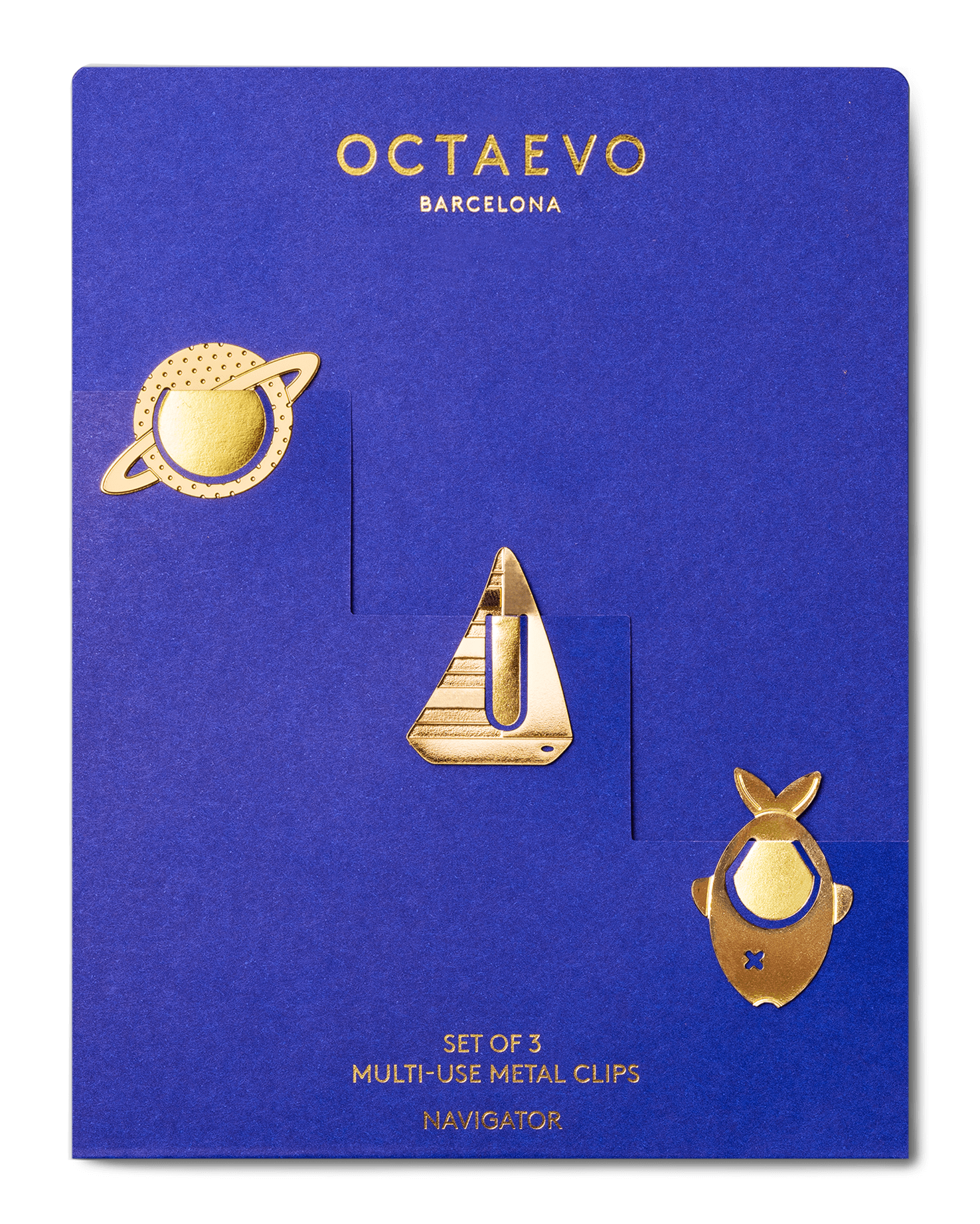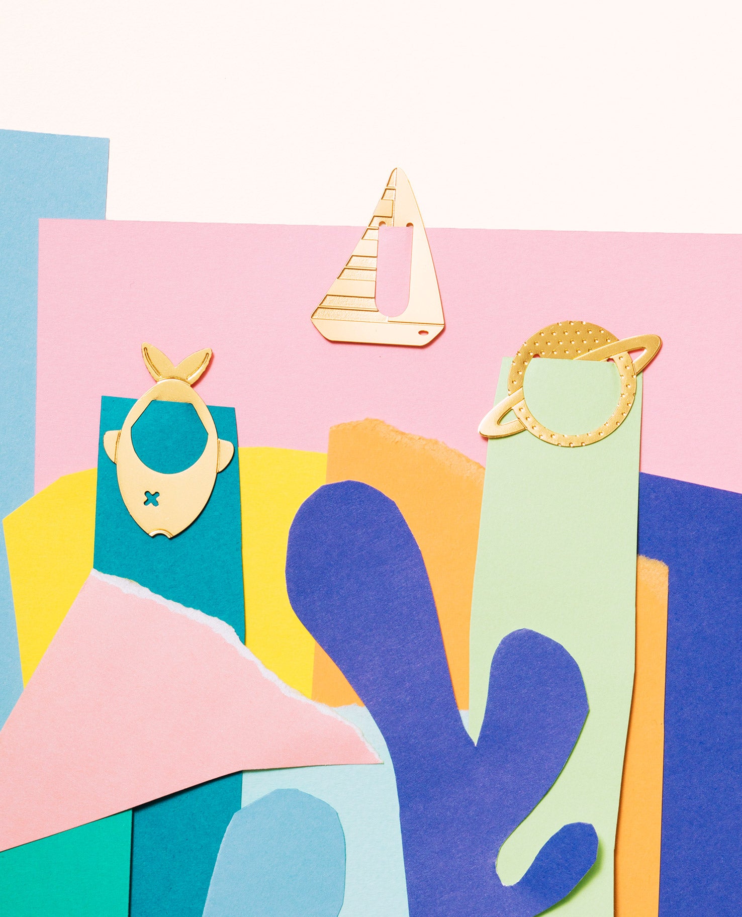 Ensemble de 3 marque-pages clips en métal : planète, voilier et poisson.