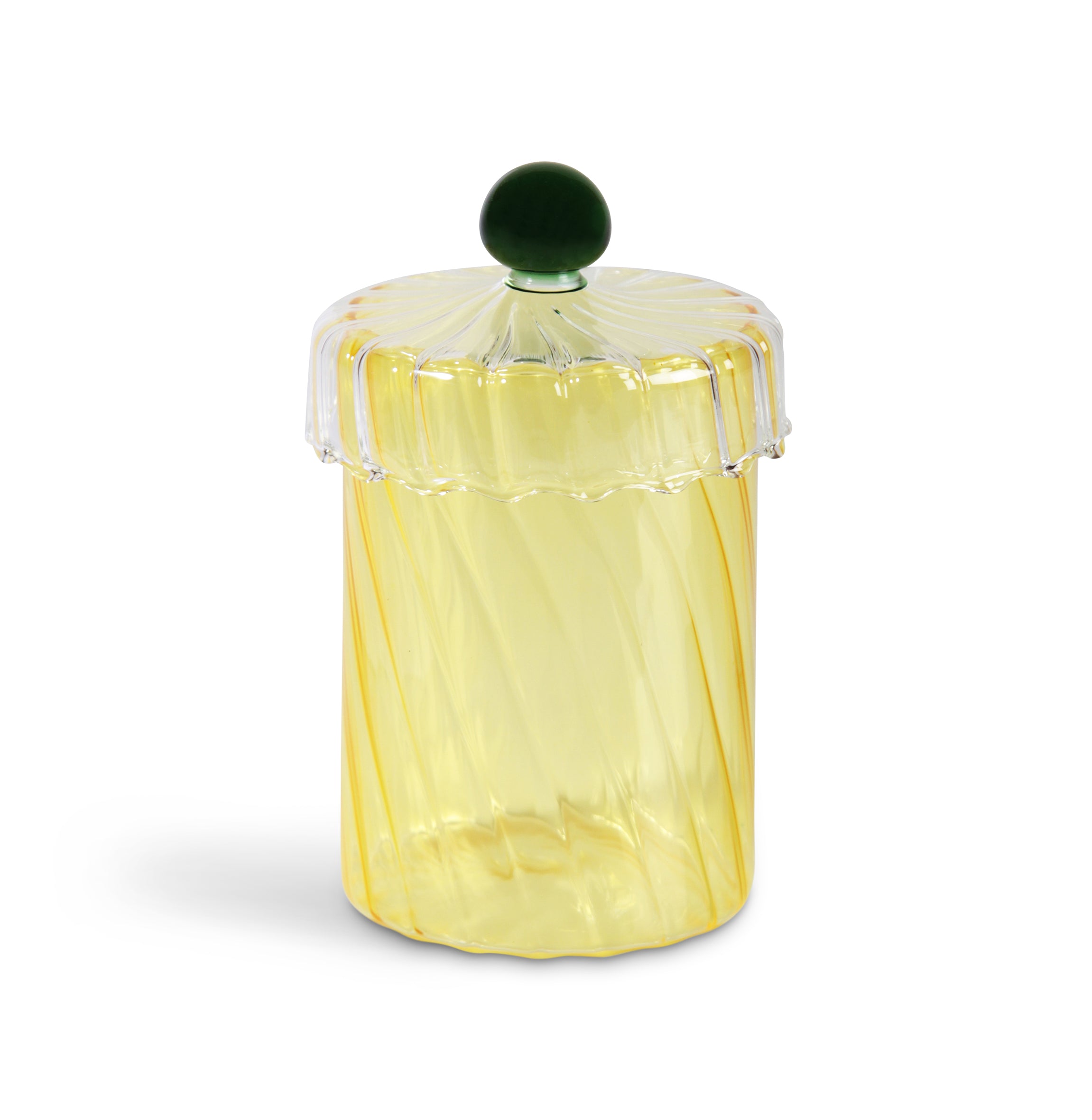 Pot en verre spiralé jaune avec couvercle transparent.