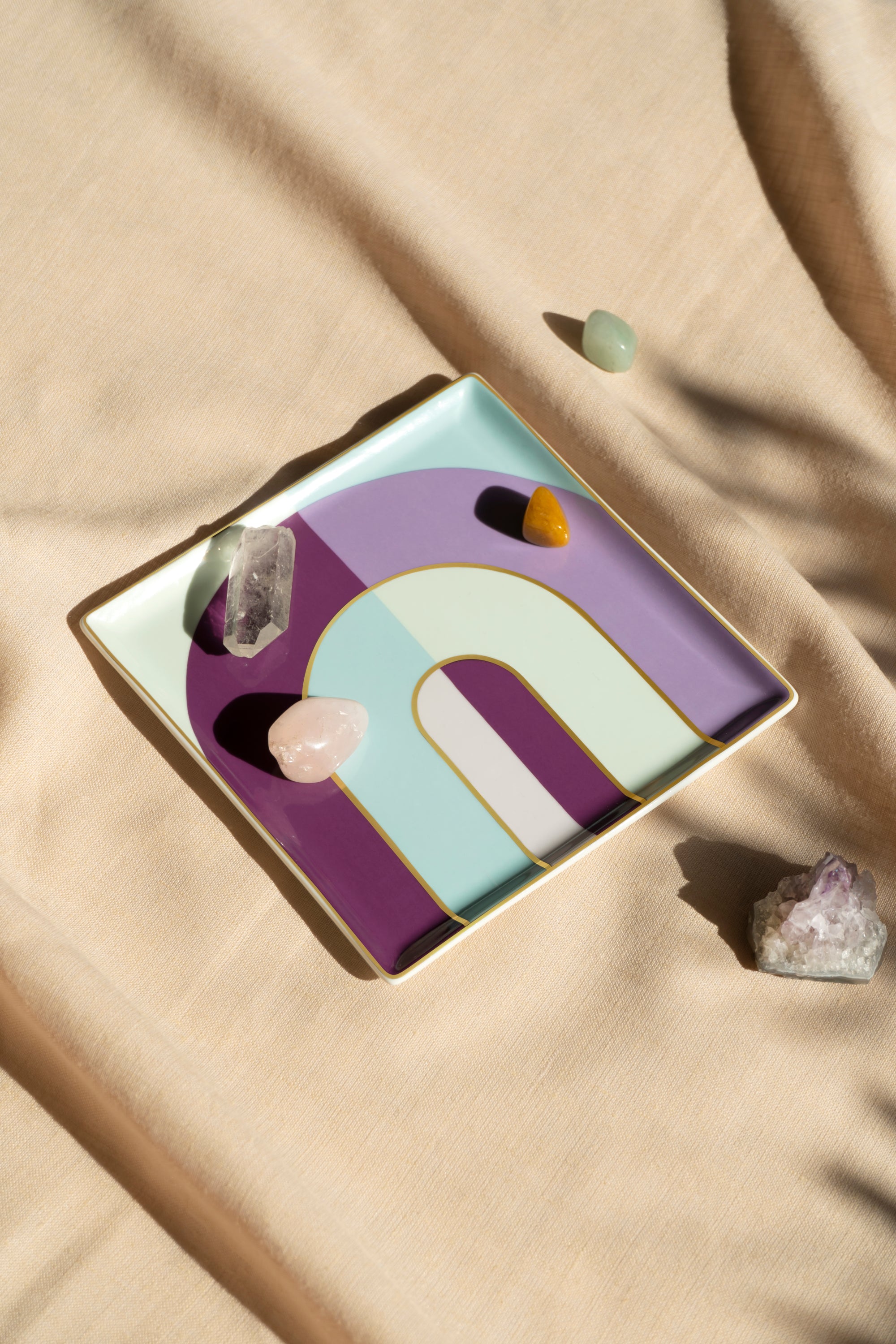 Vide-poche avec arches bleues et lilas.